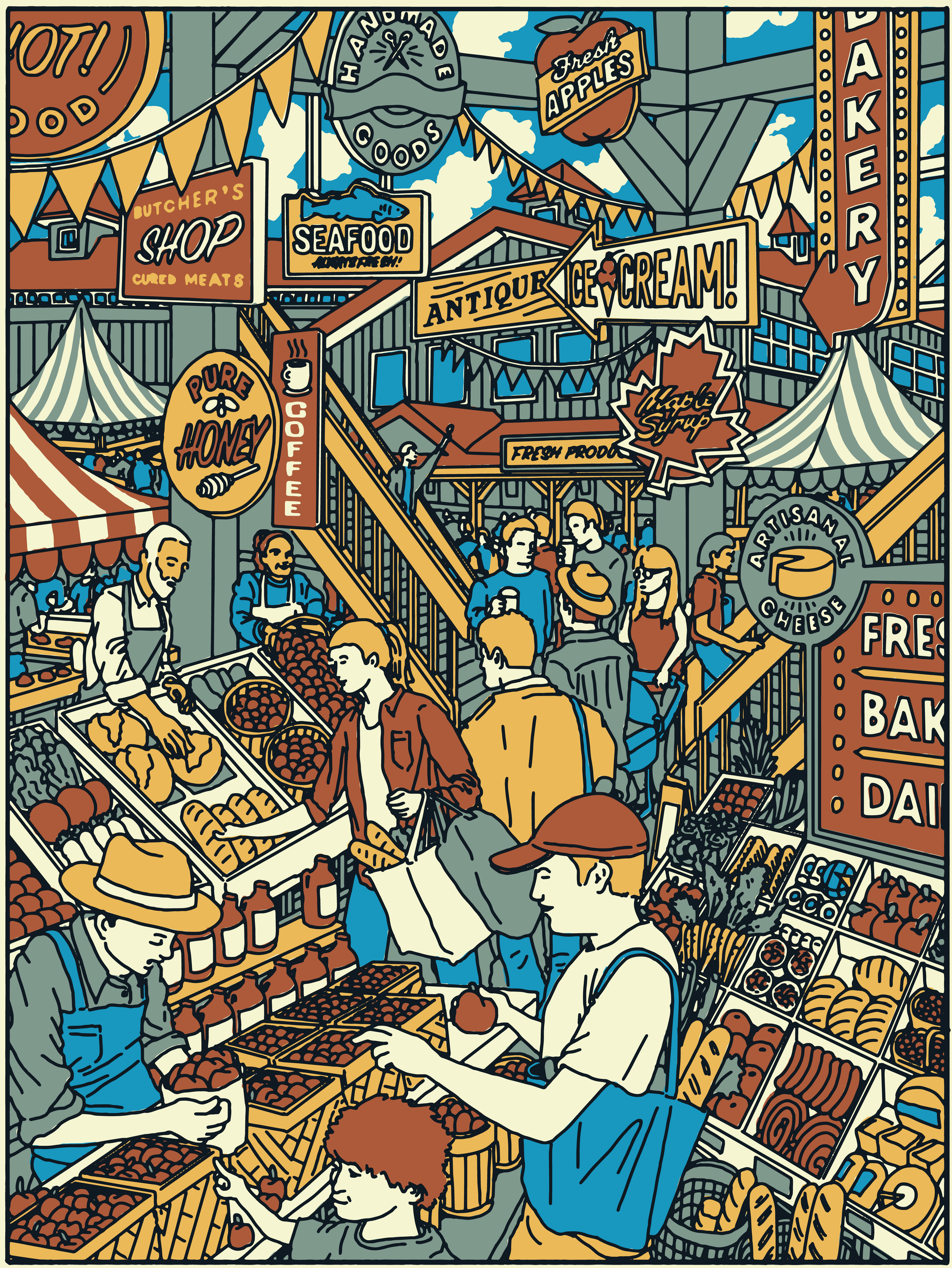 A merchandise system rooted in local pride and market culture. For St. Jacobs Market District, we developed a collection that celebrates the energy of the farmers’ market, from illustrated apparel and bold graphic totes to custom packaging and seasonal campaign materials.